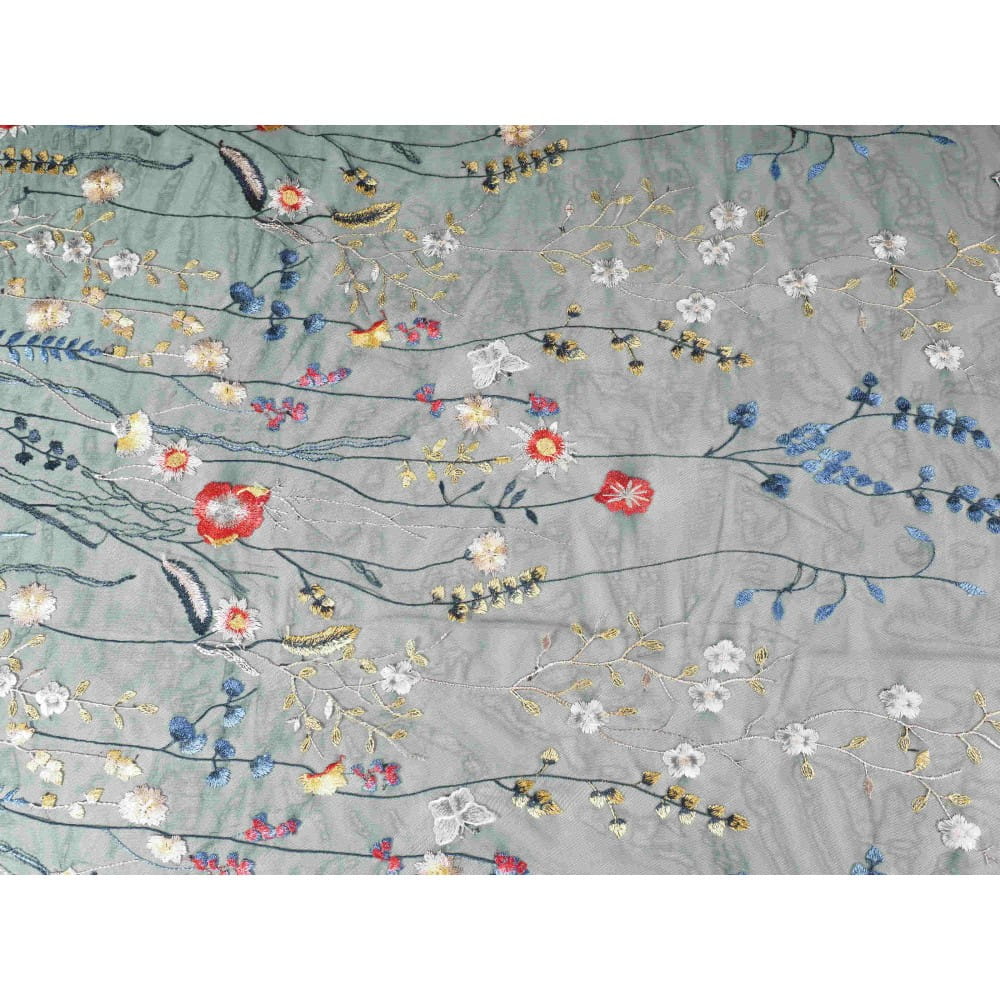 Granatowa siatka, na której są wyhaftowane motywy kwiatowe. Nadaje się idealnie na sukienki, wstawki, bluzki.