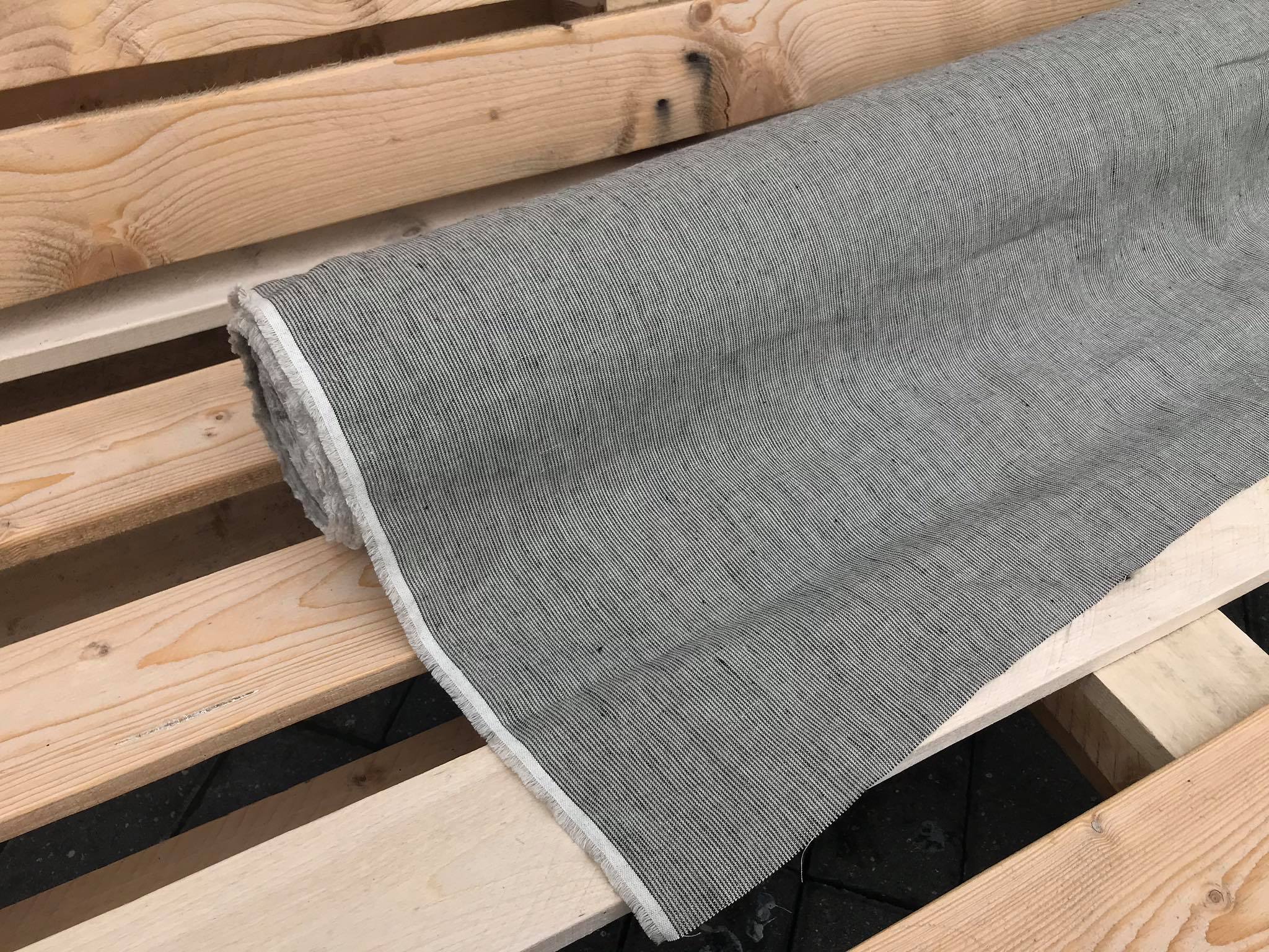 Naturalna tkanina lniana, prążkowana w kolorze beżowo czarnym o grubości 154g/m2.