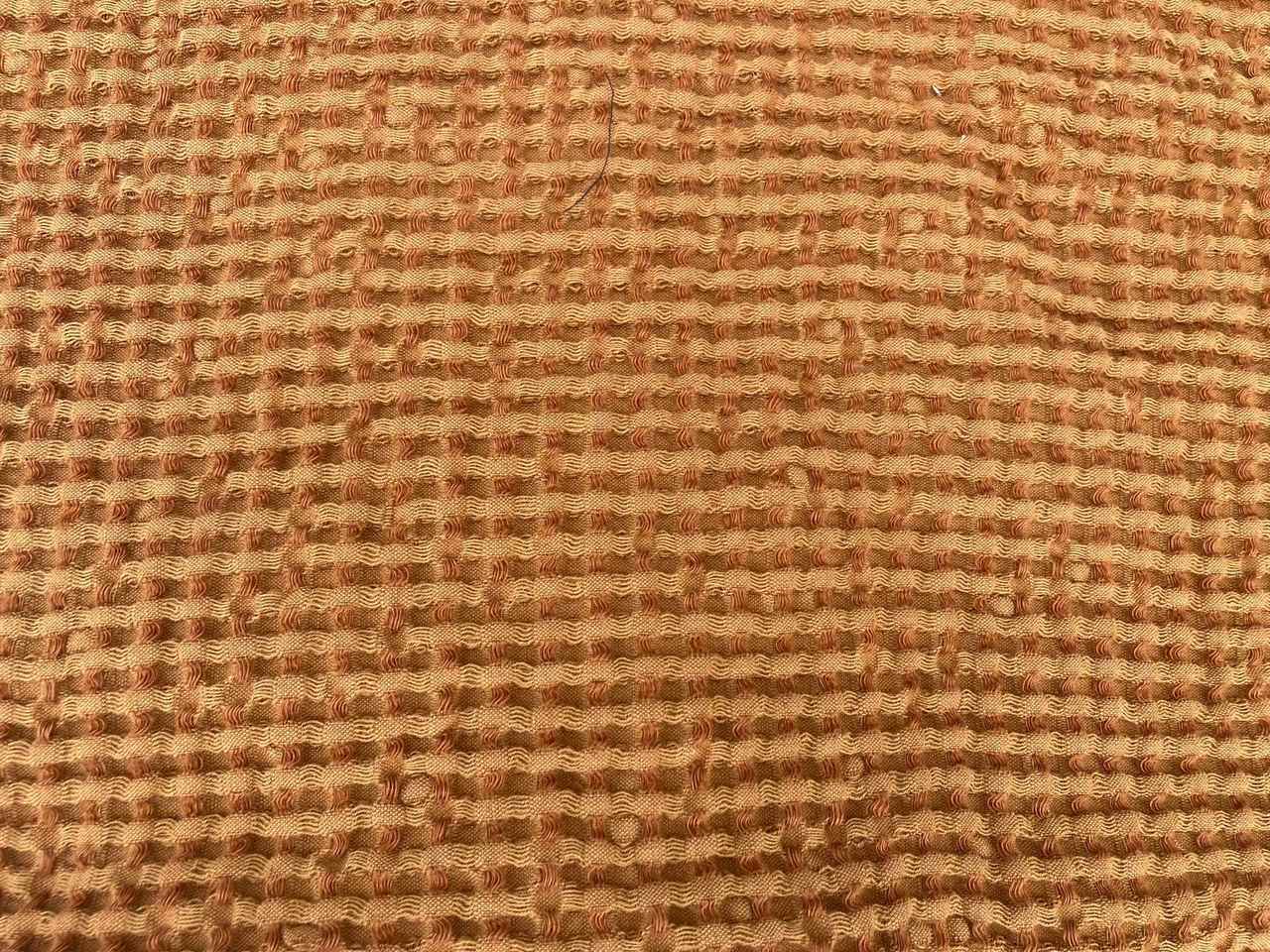 Piękna, miękka, przemiła w dotyku, delikatna dla skóry tkanina lniano bawełniana o strukturze wafla. W kolorze rude toffi. Z przeznaczeniem na otulacze, bluzy i bluzki, szale, pledy i narzuty, ciepłe ubrania, szlafroki i ręczniki.
