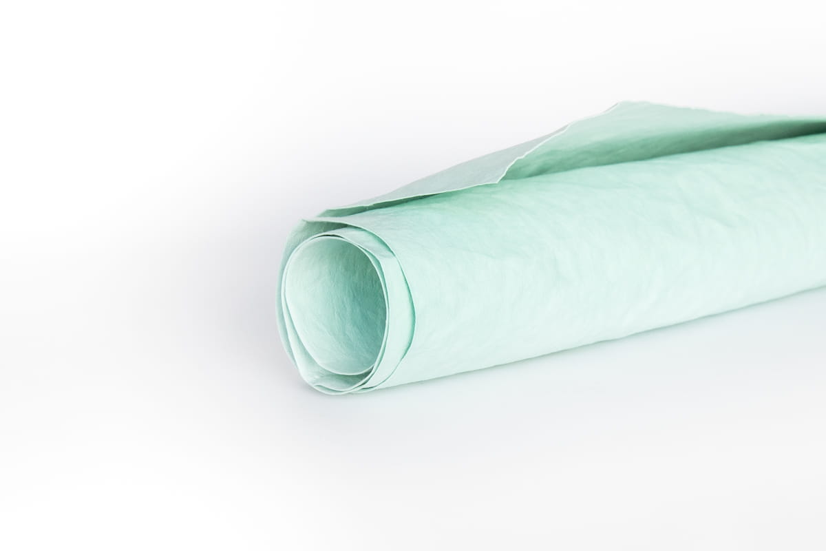 Arkusz postarzanej washpapy - papieru, który został poddany impregnacji lateksem, dzięki czemu można go prać i ponownie używać - w delikatnym kolorze miętowym.