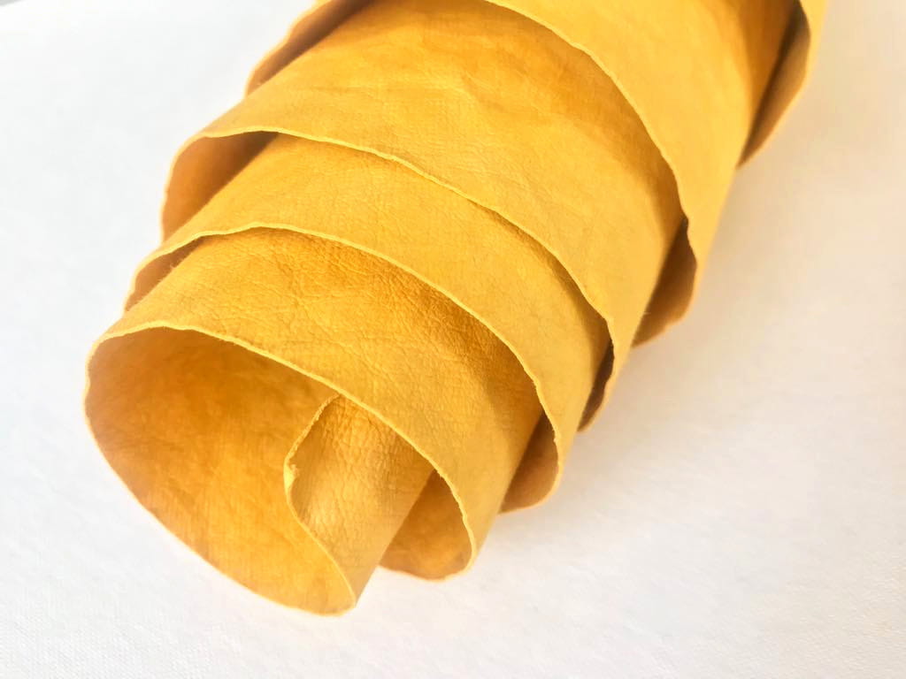 Arkusz postarzanej washpapy - papieru, który został poddany impregnacji lateksem, dzięki czemu można go prać i ponownie używać - w intensywnym kolorze żółtym.