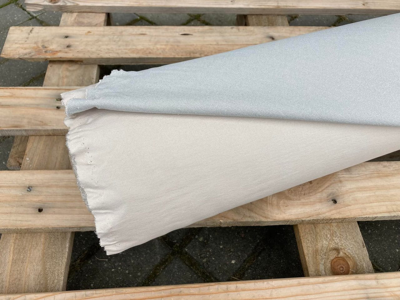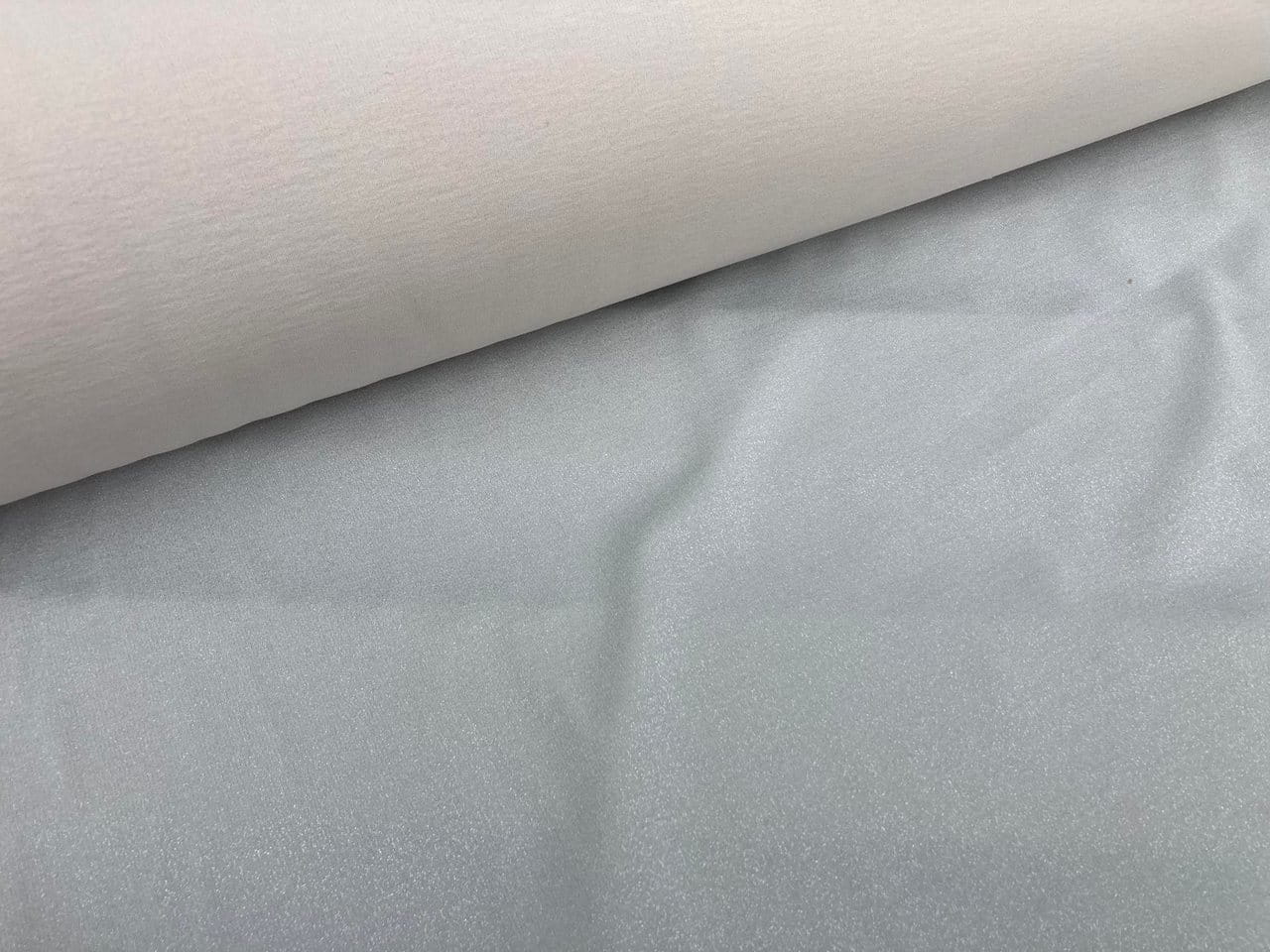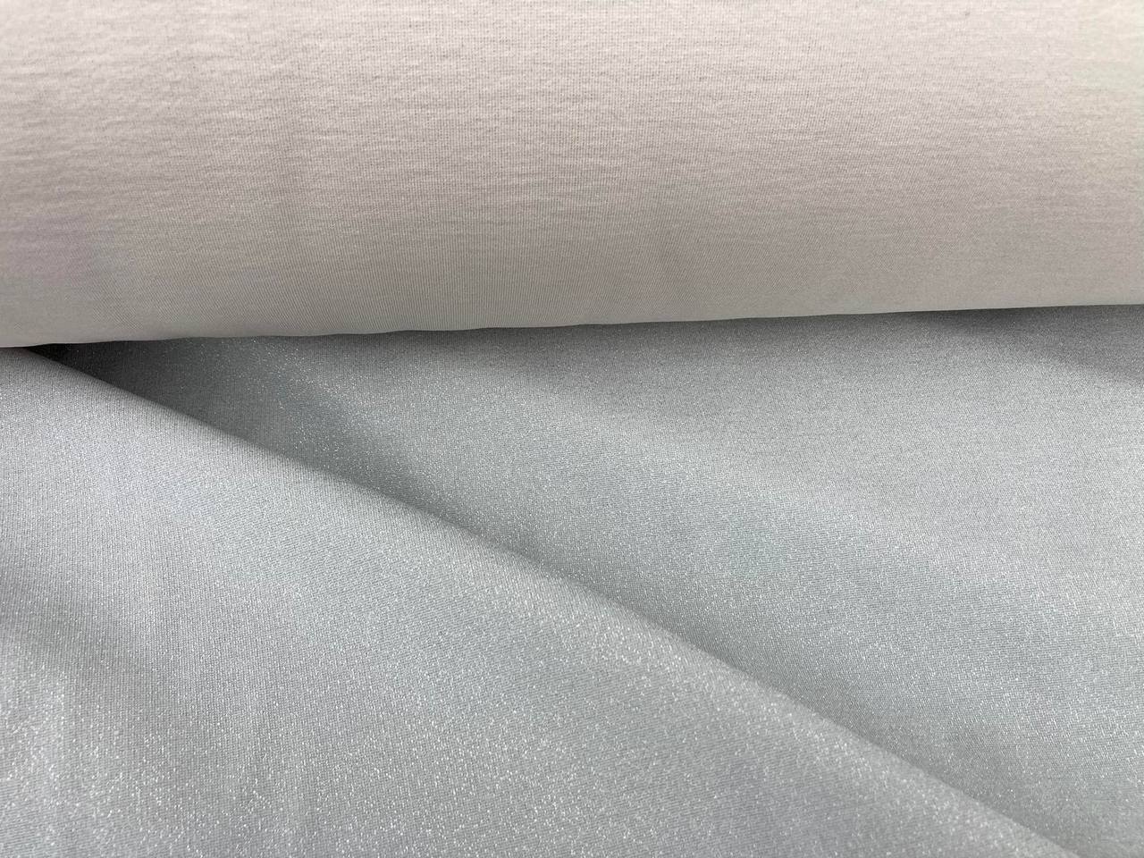 Wyskiej jakości dzianina poliestrowo wiskozowa. Z lewej strony w kolorze kremowym. Z prawej w kolorze szarym, pięknie wykończona srebrzystymi niteczkami. Bardzo rozciągliwa. Na eleganckie ubrania sportowe, sukienki, spodnie, wygodną odzież. Efektowna.
