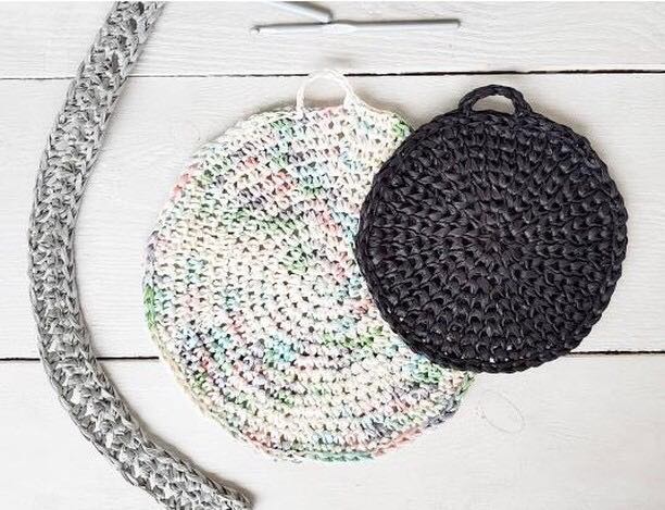 Z jednego całego motka można stworzyć podkładkę o średnicy ok 25-26 cm (większa na zdjęciu) oraz kwadratowy mini koszyk 16x16x5 cm.