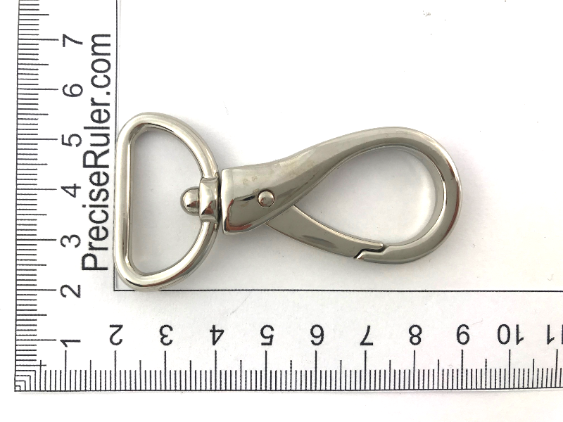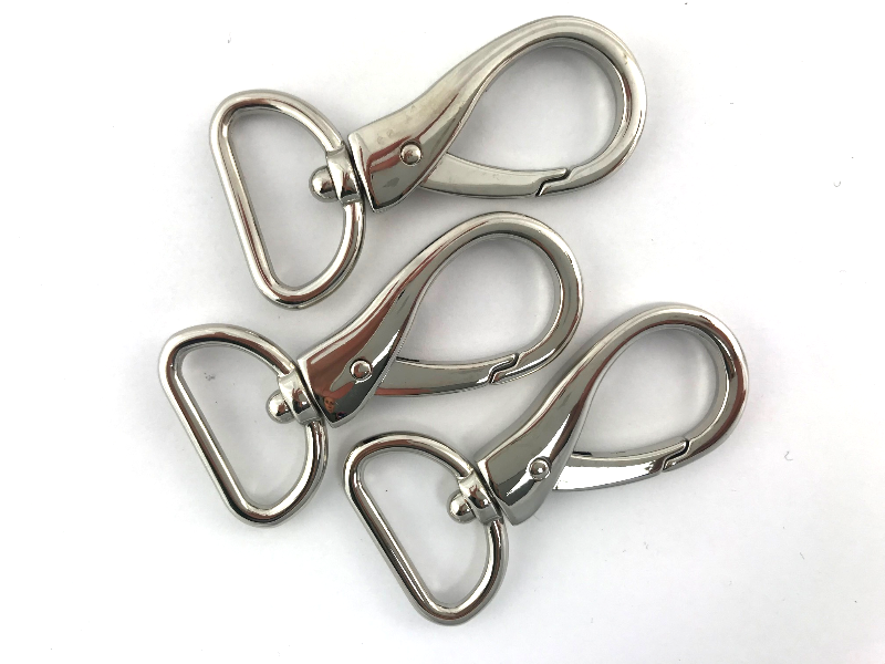 Karabińczyk nikiel, dość masywny przeznaczony na zapięcie lub ozdobę, pasuje do paska/taśmy nośnej o szerokości 25 mm.