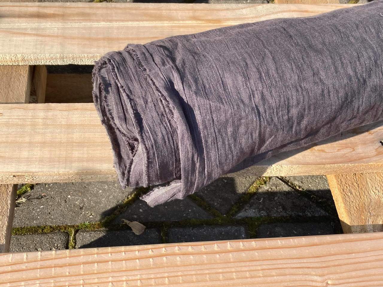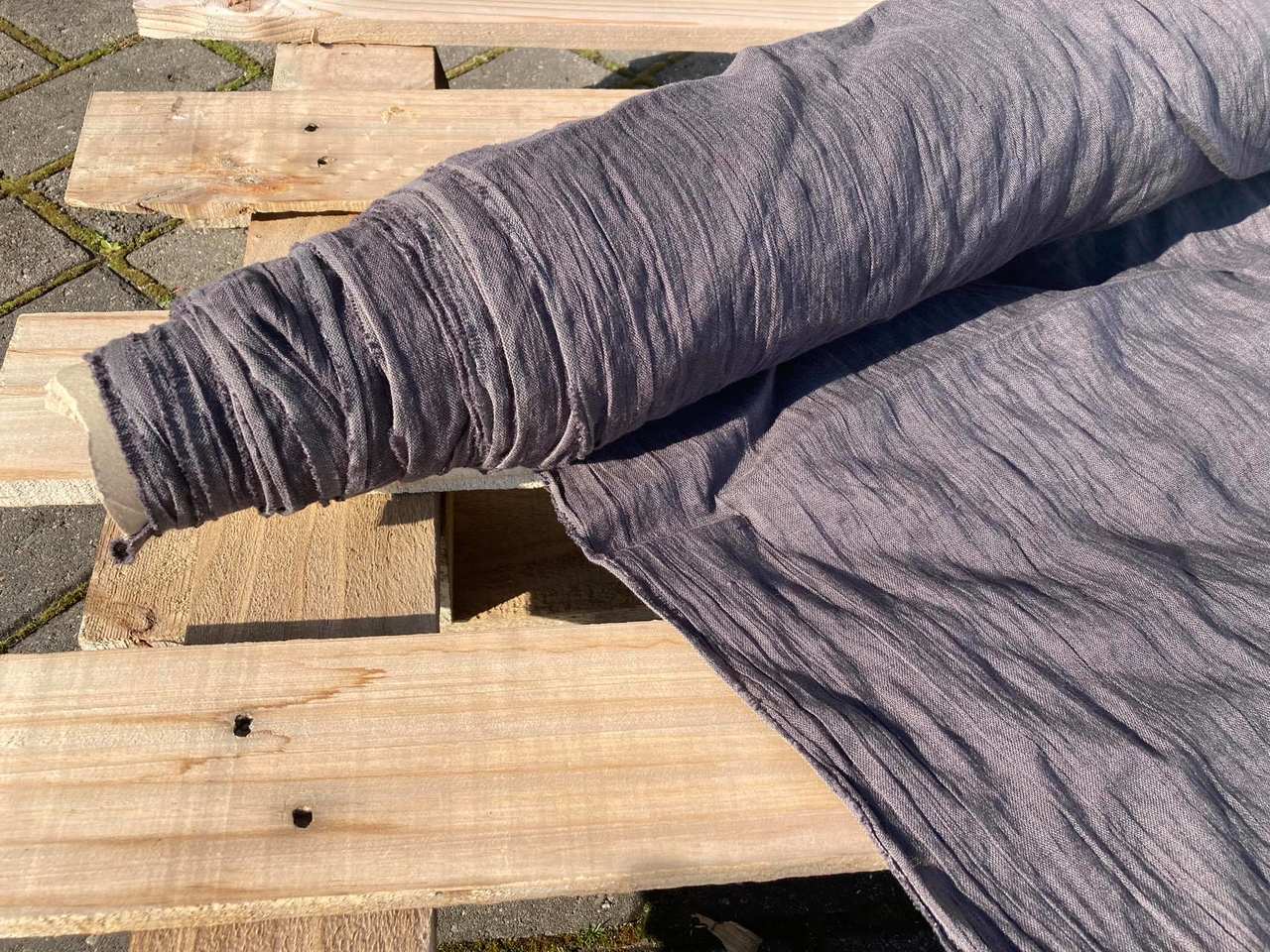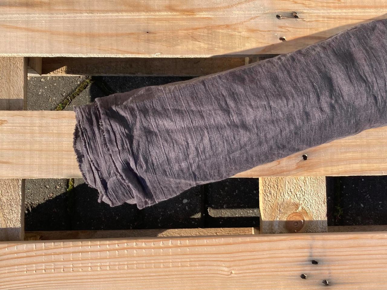 Naturalna tkanina lniana KREPA kreszowana w kolorze grafitowym, o gramaturze 145g/m2, gnieciona.