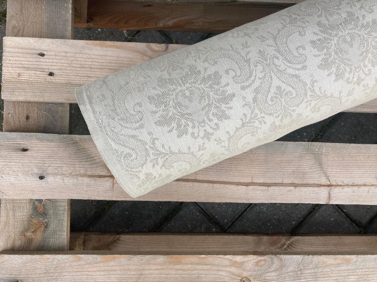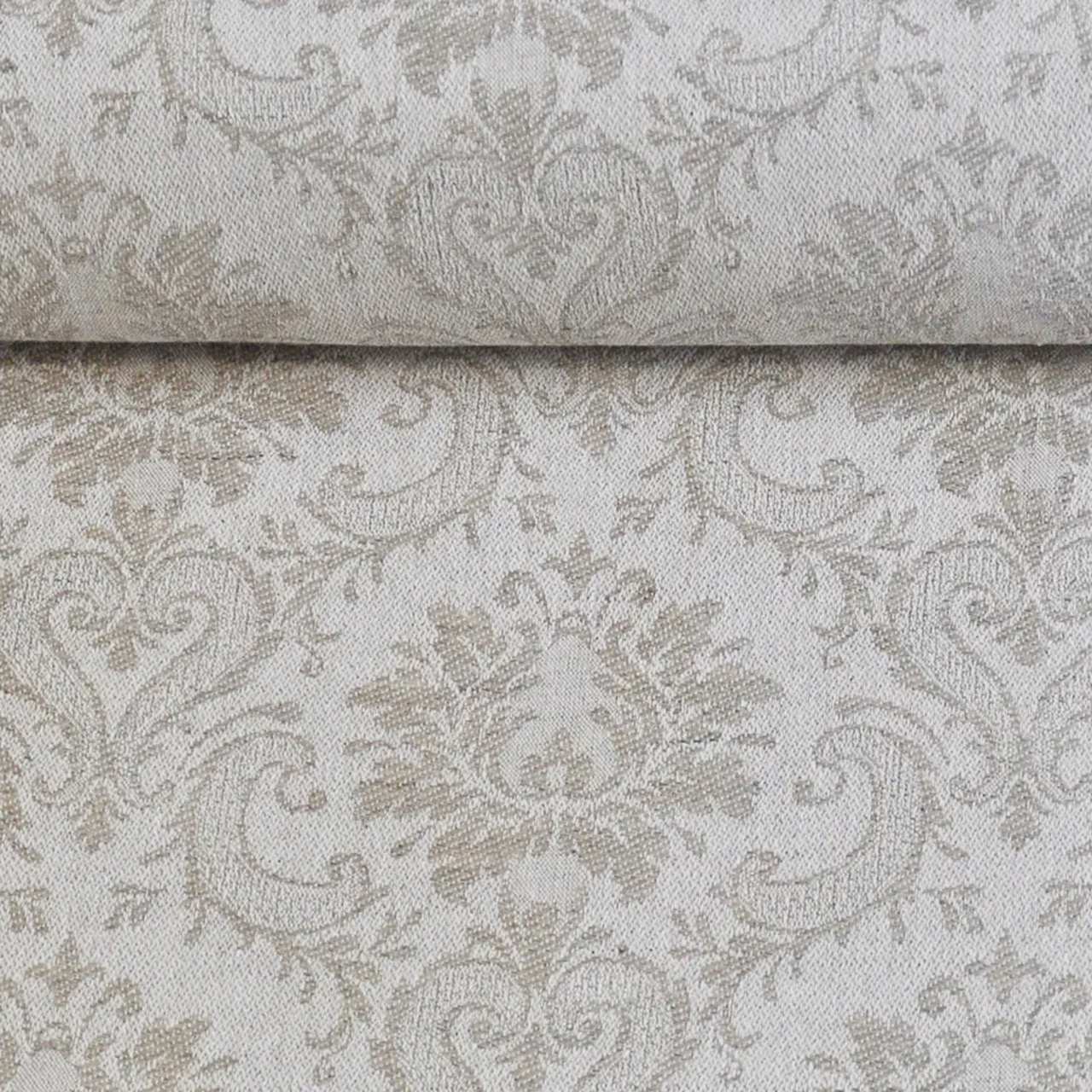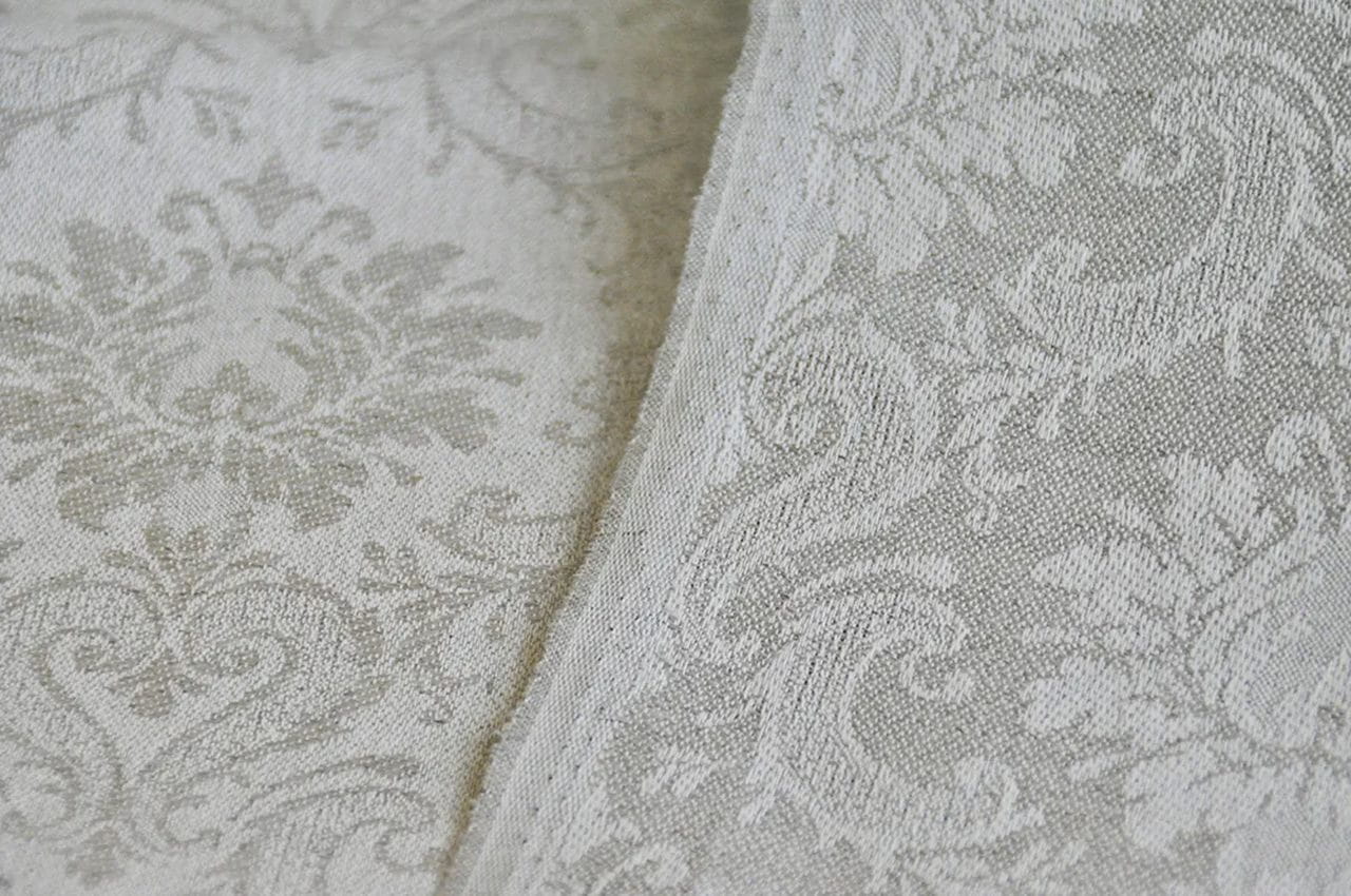 Piękna, naturalna tkanina lniana, w naturalnych kolorach - kremowa biel naprzemiennie z odcieniem naturalnego lnu - motyw ROYAL. Dwustronna, jedna strona jest rewersem drugiej. Żakardowe motywy królewskie - główne - wielkości około 9-10 cm. Tkanina nie jest zmiękczana, idealna na akcesoria, ciężkie zasłony, bieżniki, podkładki, ciężkie obrusy, poduszki, pledy.