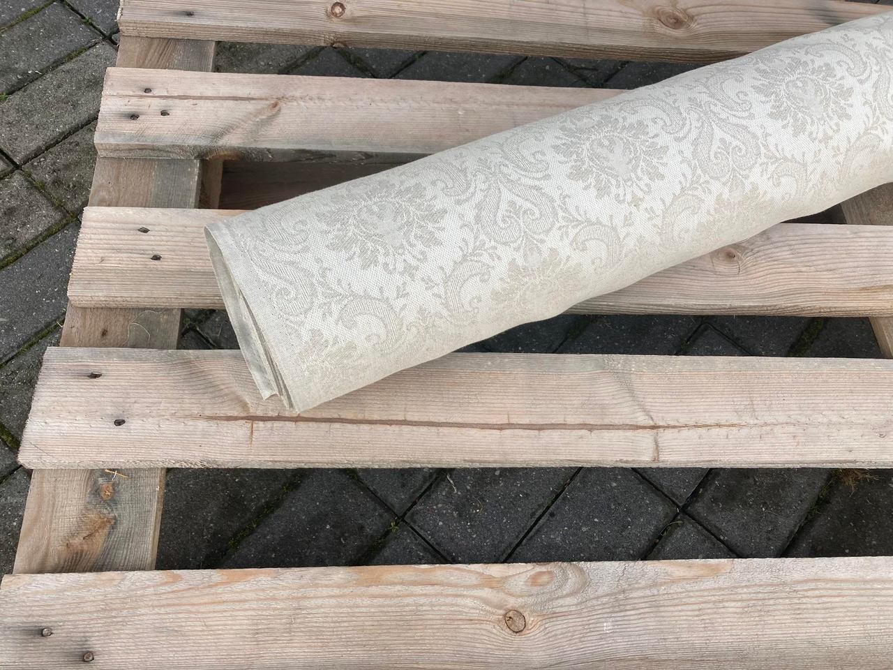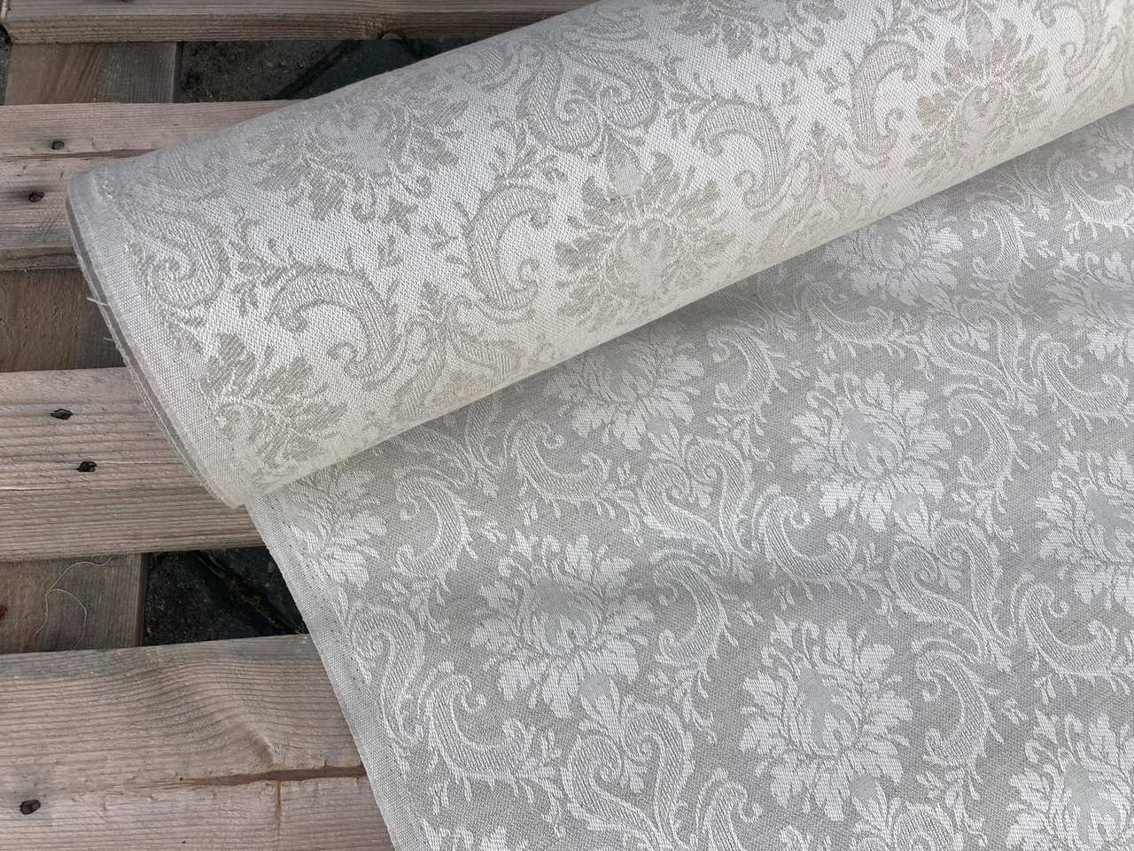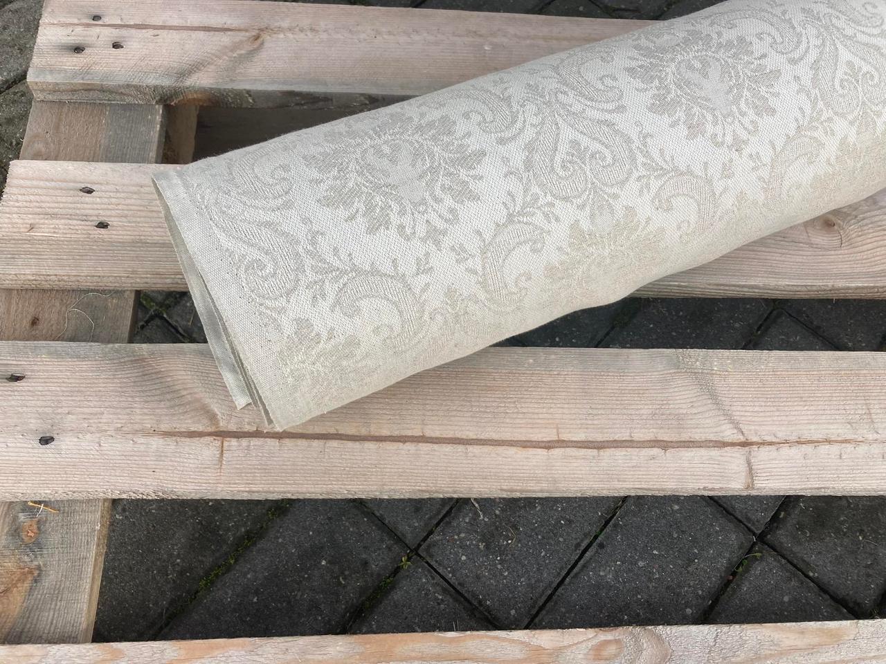 Piękna, naturalna tkanina lniana, w naturalnych kolorach - kremowa biel naprzemiennie z odcieniem naturalnego lnu - motyw ROYAL. Dwustronna, jedna strona jest rewersem drugiej. Żakardowe motywy królewskie - główne - wielkości około 9-10 cm. Tkanina nie jest zmiękczana, idealna na akcesoria, ciężkie zasłony, bieżniki, podkładki, ciężkie obrusy, poduszki, pledy.