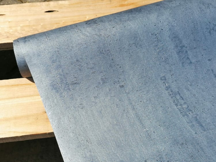 Wysokiej jakości materiał z korka naturalnego w kolorze szarym, ciepło stalowym, w świetle lekko niebieski. Gładki, na czarnym podkładzie.