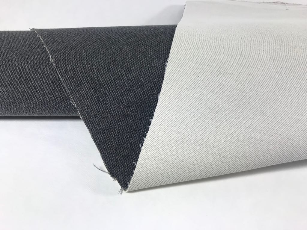Tkanina z recyklingowanej bawełny i poliestru w kolorze grafitowym, na kremowym podkładzie bawełniano poliestrowym z recyklingu. Obie warstwy klejone ze sobą. Tkanina jest dość sztywna, z wyraźną strukturą szachownicy, gładka. Idealny materiał na buty, akcesoria, torebki i plecaki.