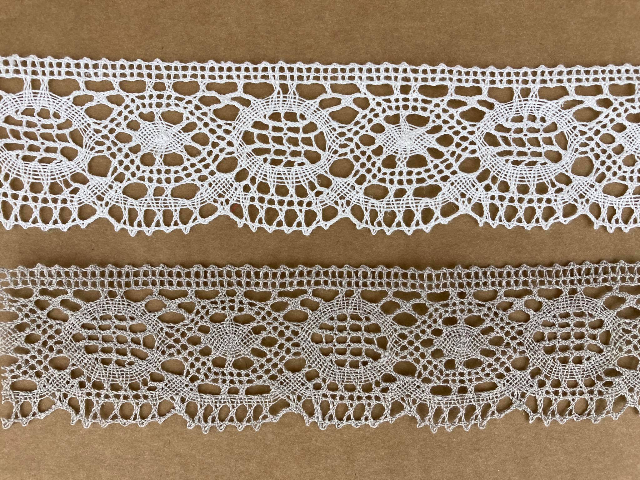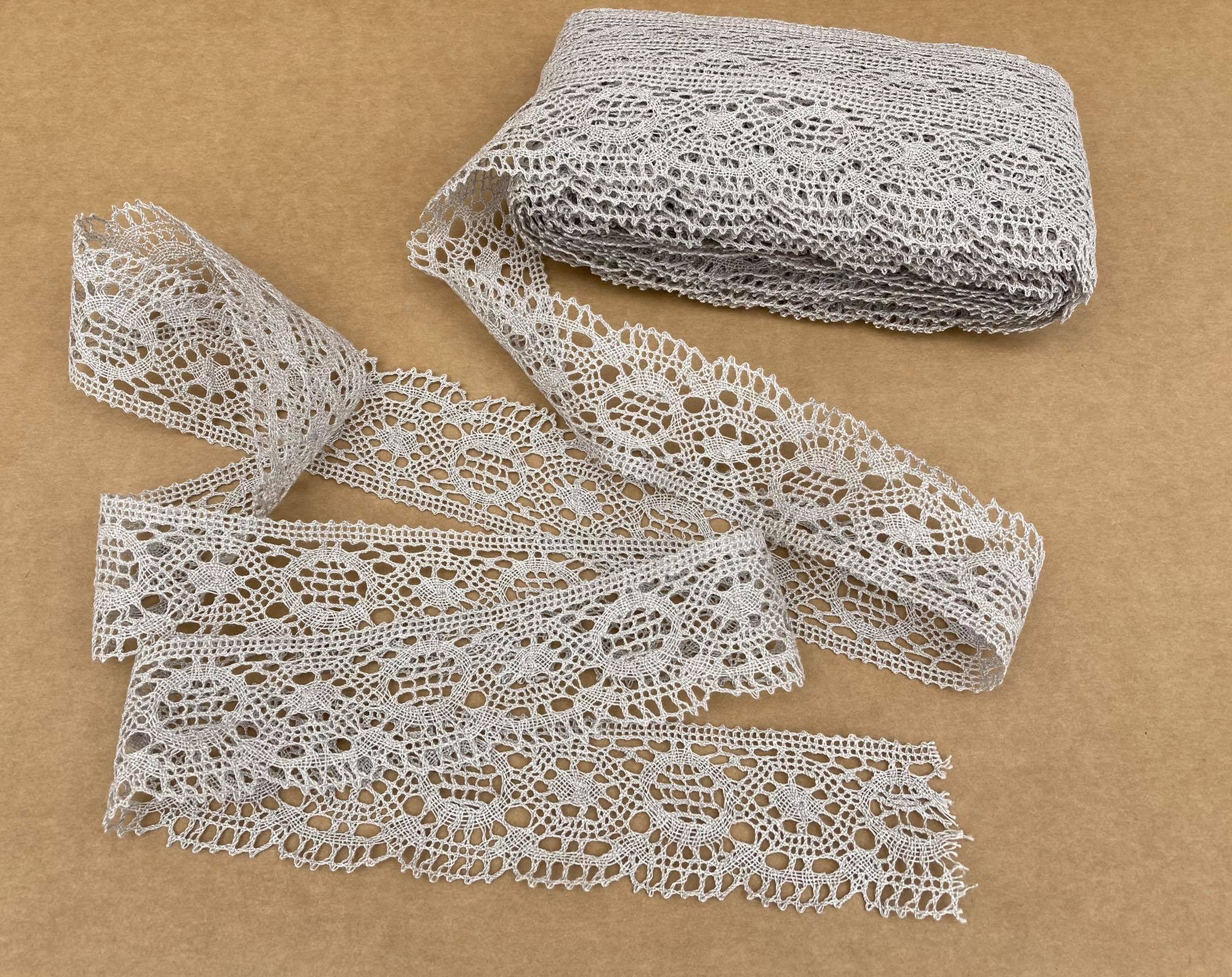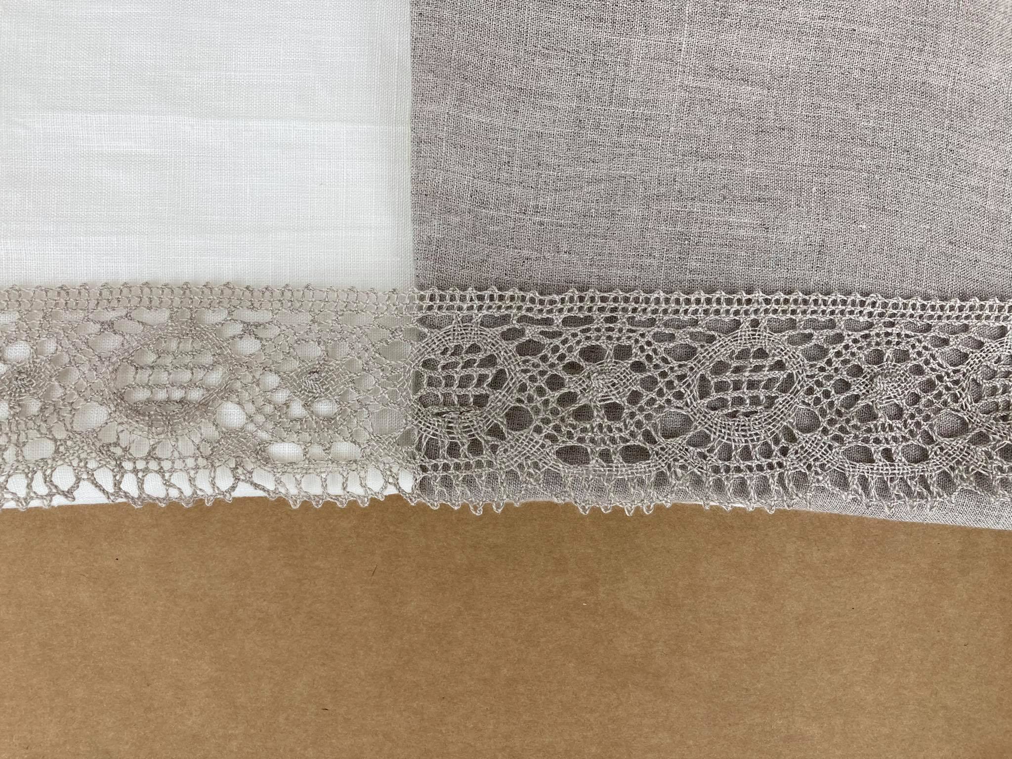 Piękna, misternie wykonana i subtelna koronka z lnianej przędzy, w kolorze naturalnego lnu. Z jednej strony wykończenie proste, z drugiej ozdobna fala.