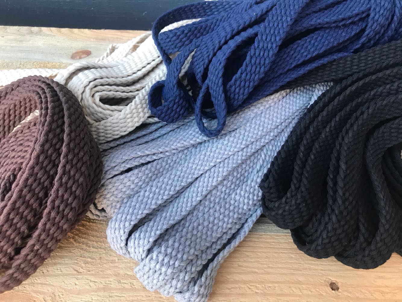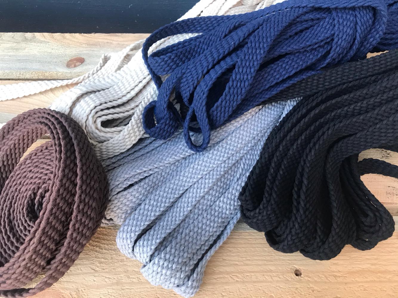 Naturalna, pleciona, bawełniana taśma w kolorze granatowym o szerokości 2 cm i grubości około 4 mm. Idealna na paski do toreb i dekoracyjne wykończenia. Ozdobna i efektowna.