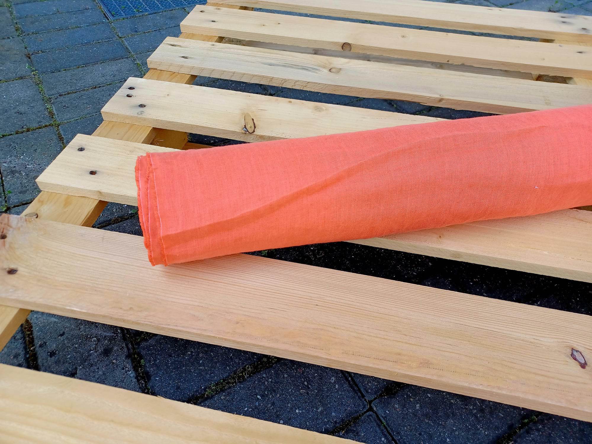 Tkanina konopna - tkanina 100% z konopi w kolorze koralowo pomarańczowym, zmiękczana, o grubości 154 g/m2.