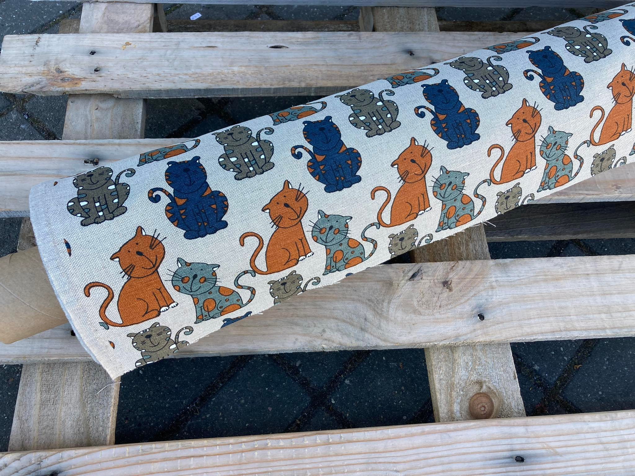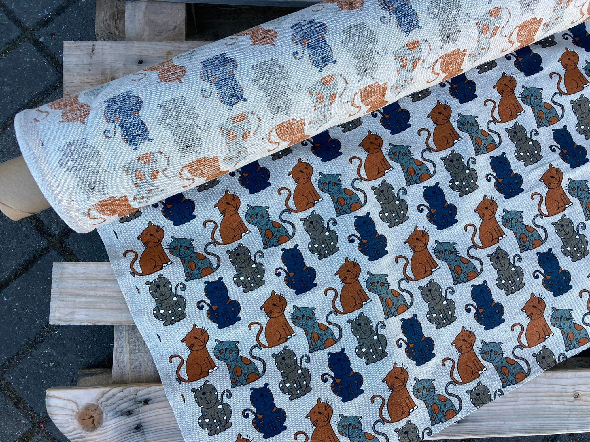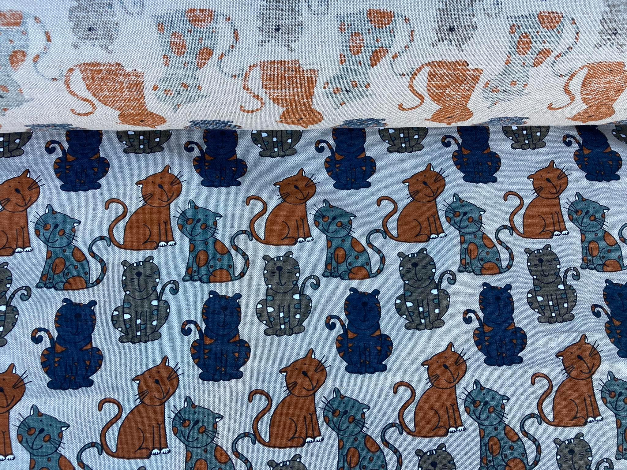 Tkanina nadrukowana w motywy dziecięce, rude, zielone i brązowe kotki. Nadruk z jednej strony, na lnie w kolorze naturalnym.